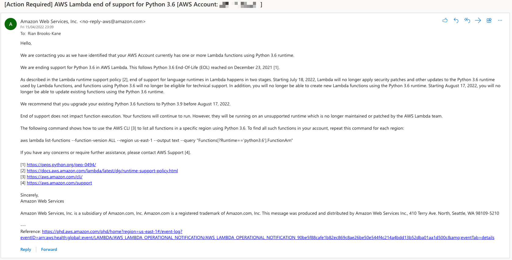 I was checking my emails this morning and saw I had a bunch of emails from AWS about end of support for Python 3.6 on AWS Lambda. Here’s what it looked like: