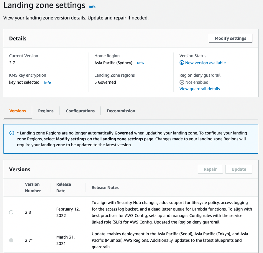 Looks like I’m one version behind. Let’s update it and see if this resolves our issue with an outdated Lambda Python runtime. I’m not going to go over this process step by step, but if you’re interested in how to update your AWS Control Tower, have a read of my previous blog post.