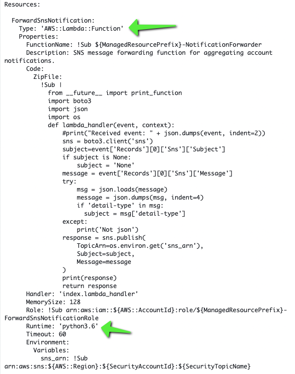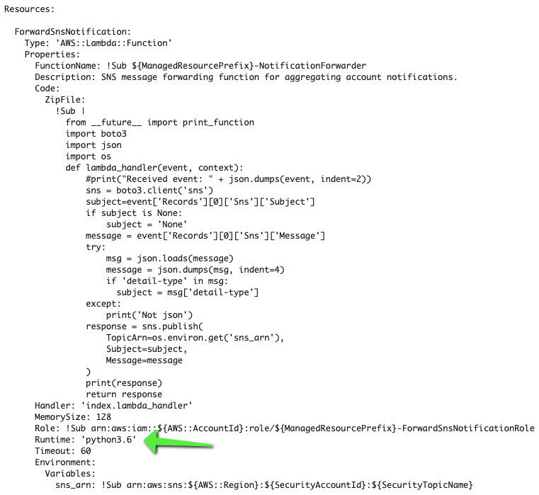 Here is some of the template code, where we can see it will create the Lambda Function, with a Python 3.6 runtime.