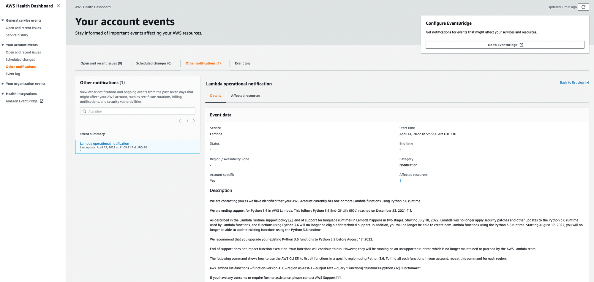 Under Other Notification, I found the alert in question: Lambda Operational Notification This contained the same message from the email but also provides you’re a list of the affected resources in your account, in my Audit account, it looks like I only have 1 affected resource.