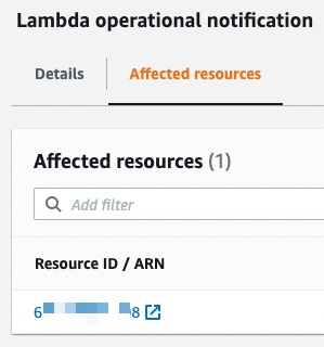 Annoyingly, the resource listed is just my account ID. Surely it would be better just to see a list of all the Lambda functions that are affected instead. After all, the CLI command to find the resource is right there in the body of the alert text.