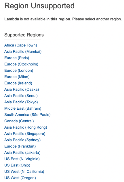 Clicking the Account ID link shows another no so great interface decision. Turns out, the link is just to the AWS Lambda console (not a specific resource) and because the Health Dashboard is a global service, I now get asked to select a region.