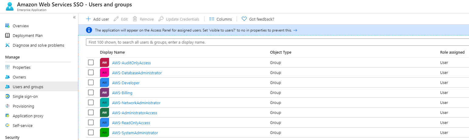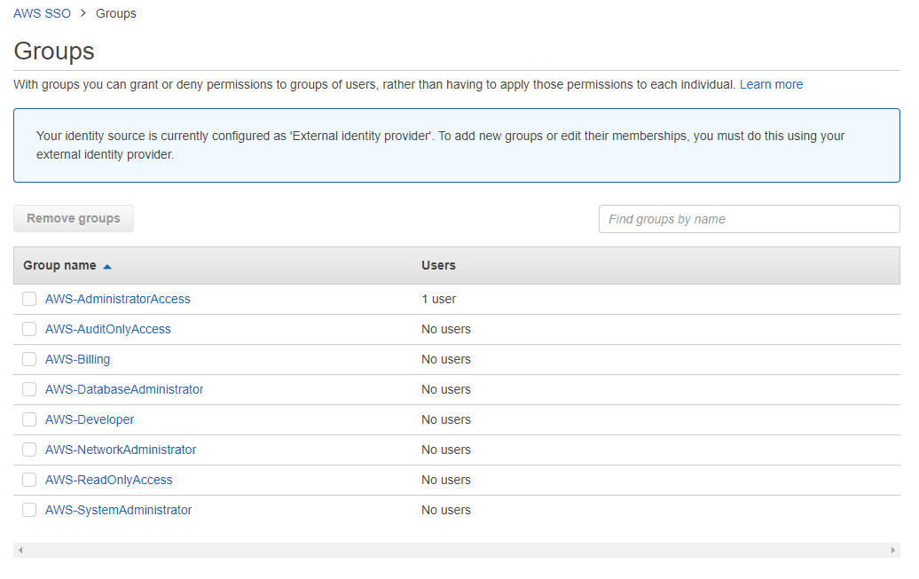 Under Users and Groups, add all the users and groups you want to synchronise across to AWS SSO. This allows you to maintain the same level of Role Based Access Control your used to in your environment.