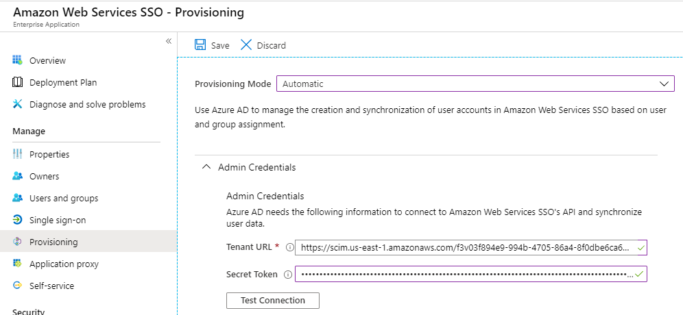 Back in the Azure AD console, change the provisioning mode to Automatic in the provisioning section of the enterprise app.