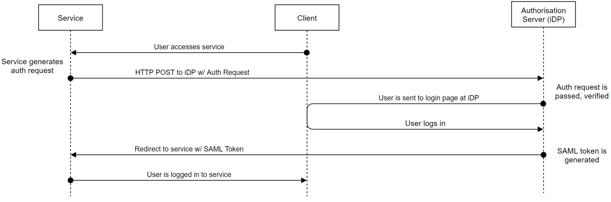 - The service redirects the user with a SAML request to the Identity Provider to authenticate