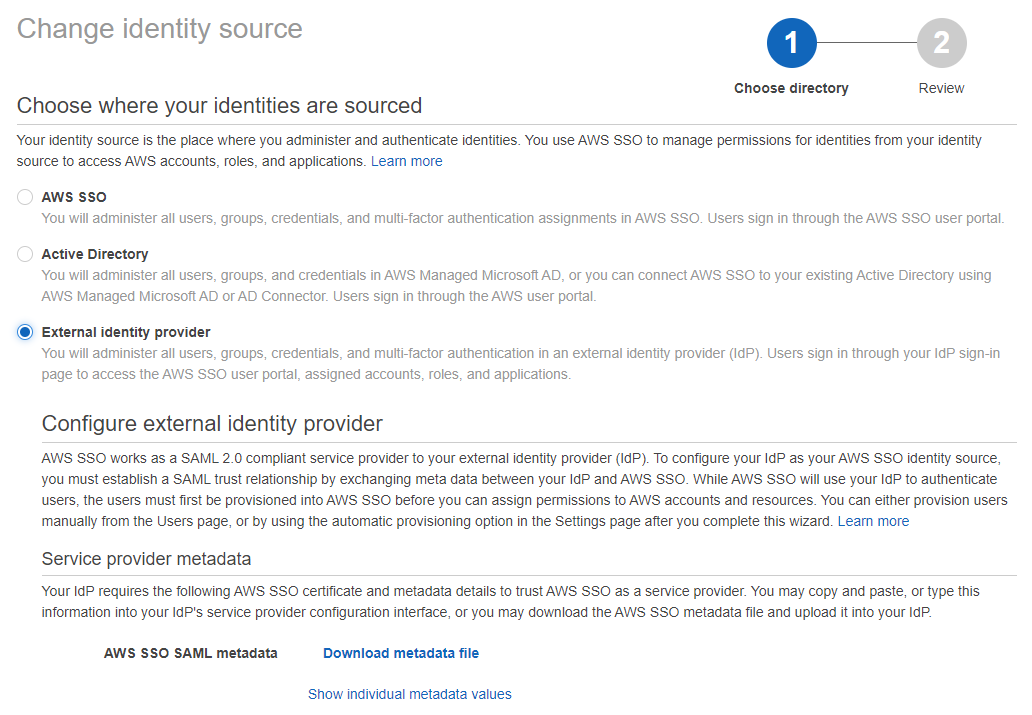 Back in the AWS SSO console, it will be waiting for us to upload the Identity provider metadata. We can now take the Metadata file we've just downloaded from Azure AD and upload it.