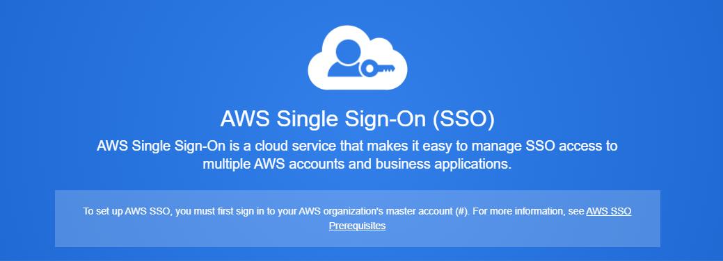 Firstly we need to go to the AWS Console on the master account and go to AWS Single Sign-On, this will present us with the AWS Single Sign-On Page.