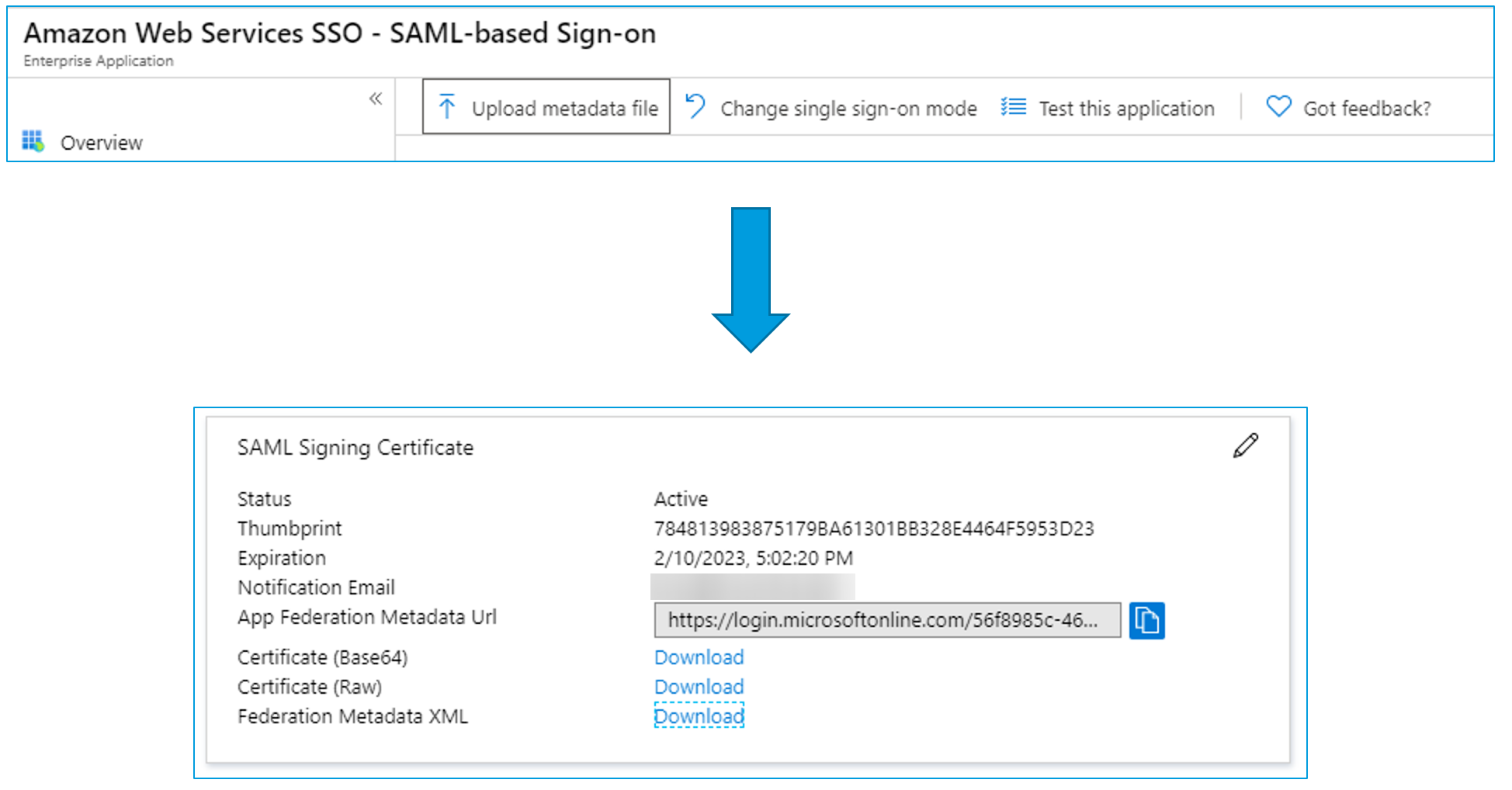 Now we need to upload the Metadata file we got from the AWS SSO console and then download the Metadata file provided by Azure AD.