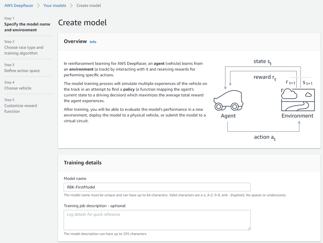 The training gives you a bit of an overview of DeepRacer and then gets you straight into building your first model. Following the training our first model is basically going to be using the defaults.