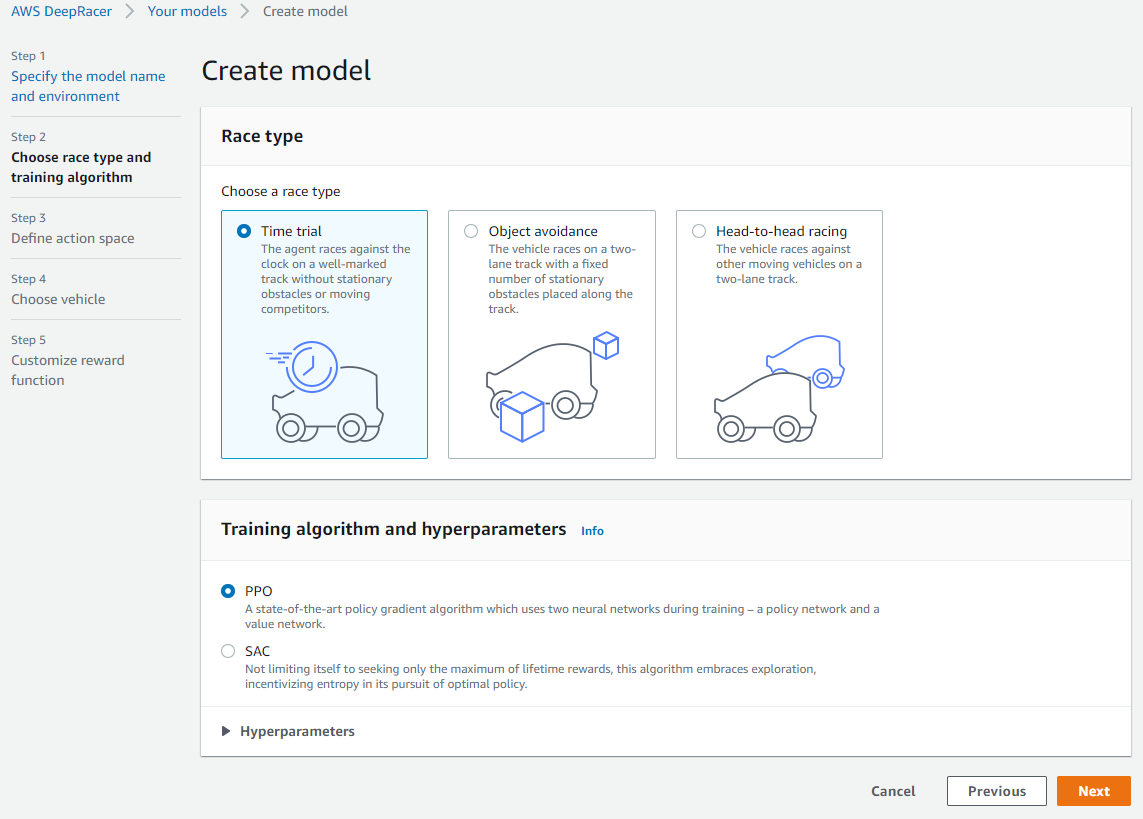 Now the training document was a little out of date from the console, so I left it with the defaults selected for the race type and algorithm and then continued.