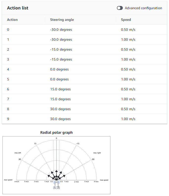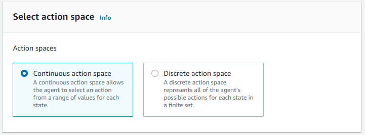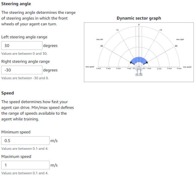 With Continuous action space you set the min/max settings that the agent can choose to use during the training, and it uses these ranges when taking actions to learn the best settings to use during the training. With DeepRacer this means we set the steering angle and speed ranges.