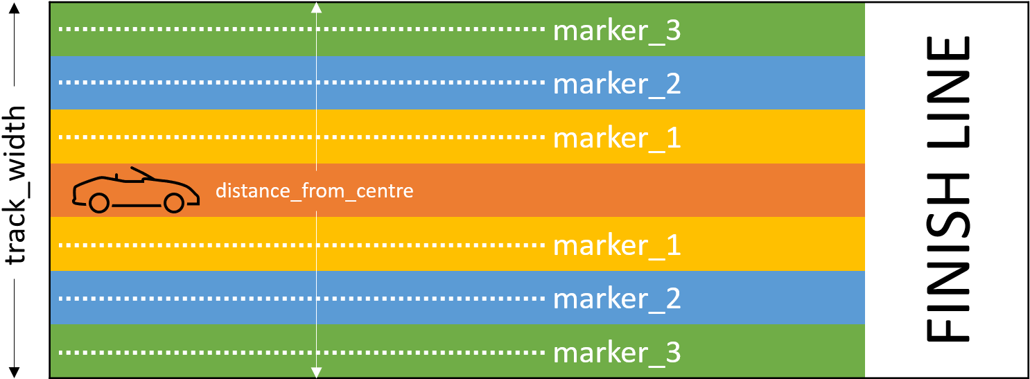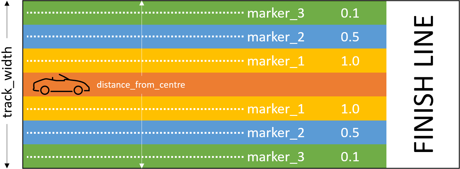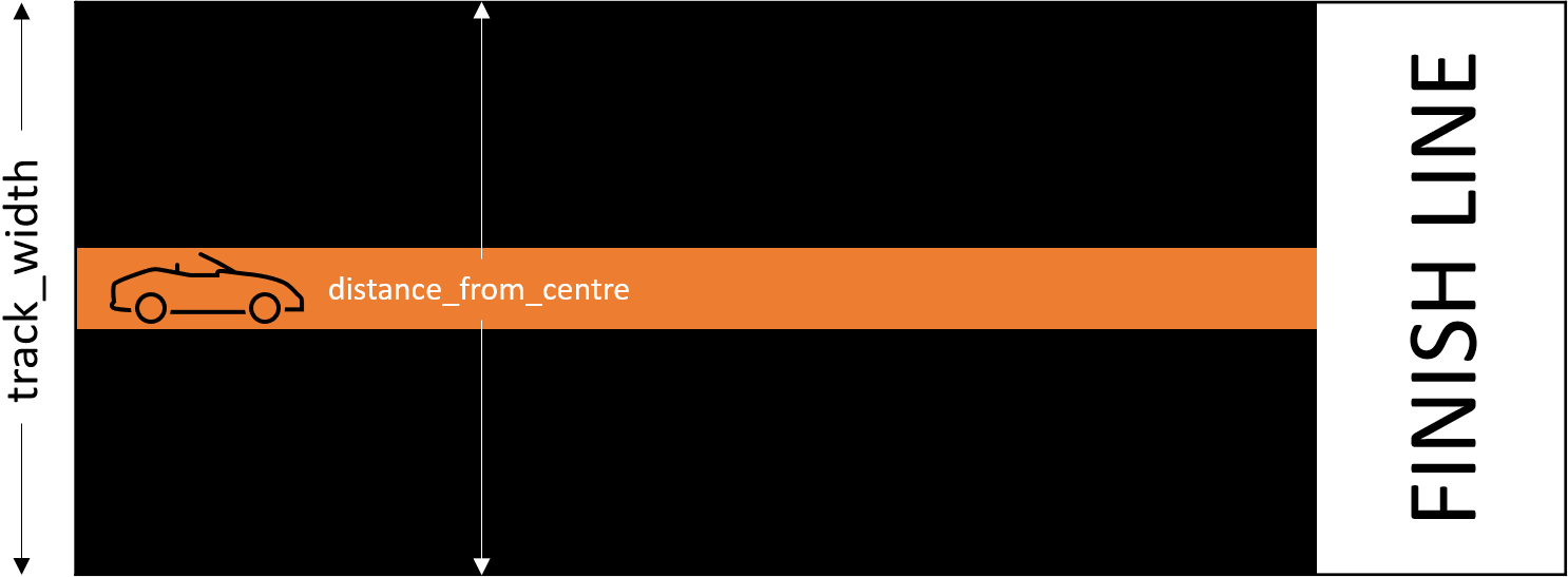 In our reward function, we have two input parameters, the width of the track, and our distance from the centre line
