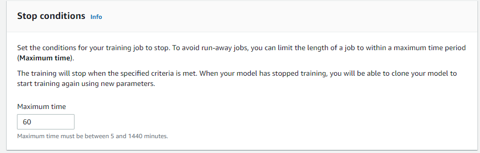 We then set a stop condition, so we don’t end up with a large AWS bill.