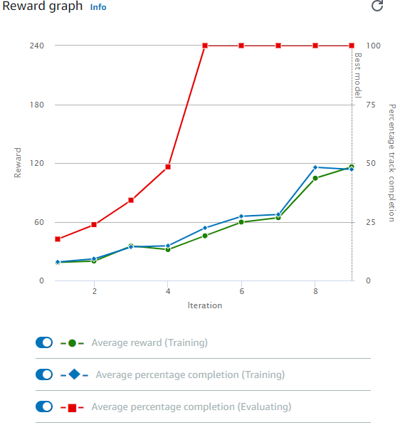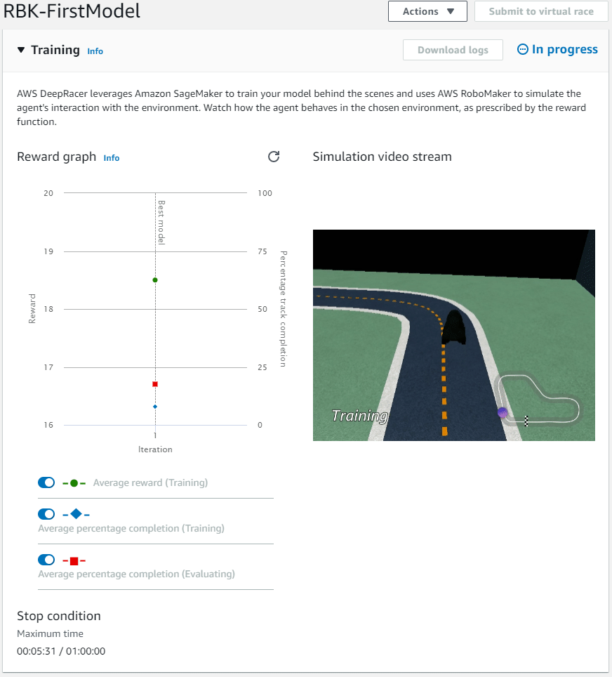 Our model has finished its first training run after 60 minutes, as you can see it looks like the DeepRacer got better over time.