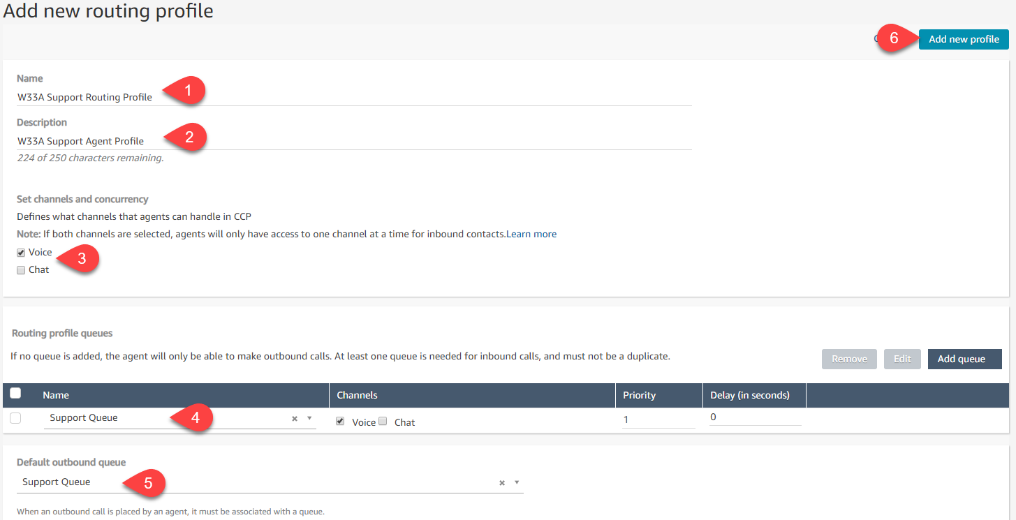 Then we need to create a routing profile, these profiles are assigned to agents and tell connect what queues the agent works on.