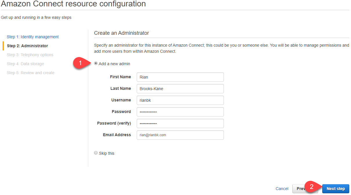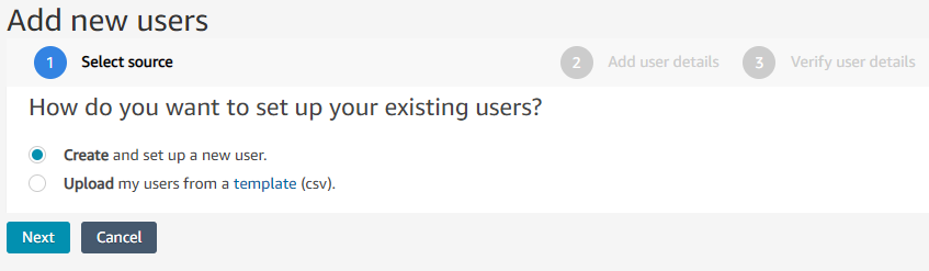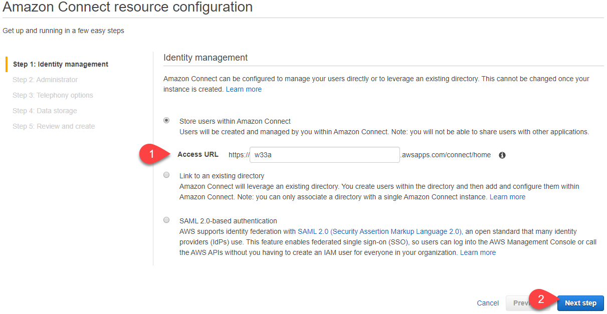 Next, we need to configure our identity management. In this example, I’m just going to use a new directory but if you have an existing one (such as Active Directory) or want to use SAML, you can do that here.