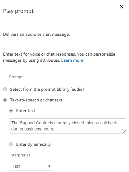 Let’s go back to Out of hours now, we are going to play a prompt to the caller telling them to call back during business hours.