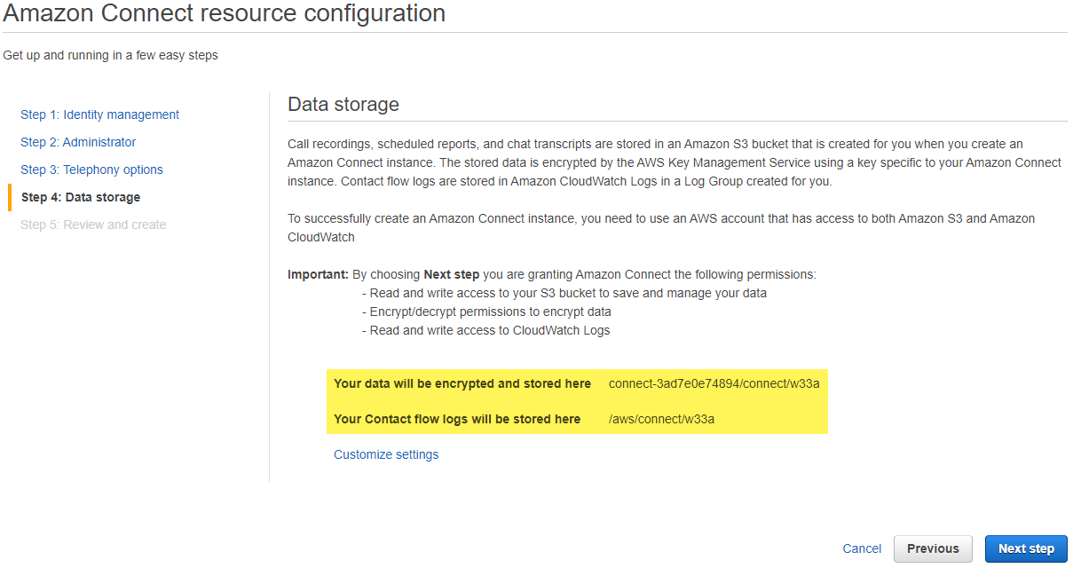 All data produced to Amazon Connect is stored in S3. In the Data storage settings, you can specify where things are stored and how they are encrypted.
