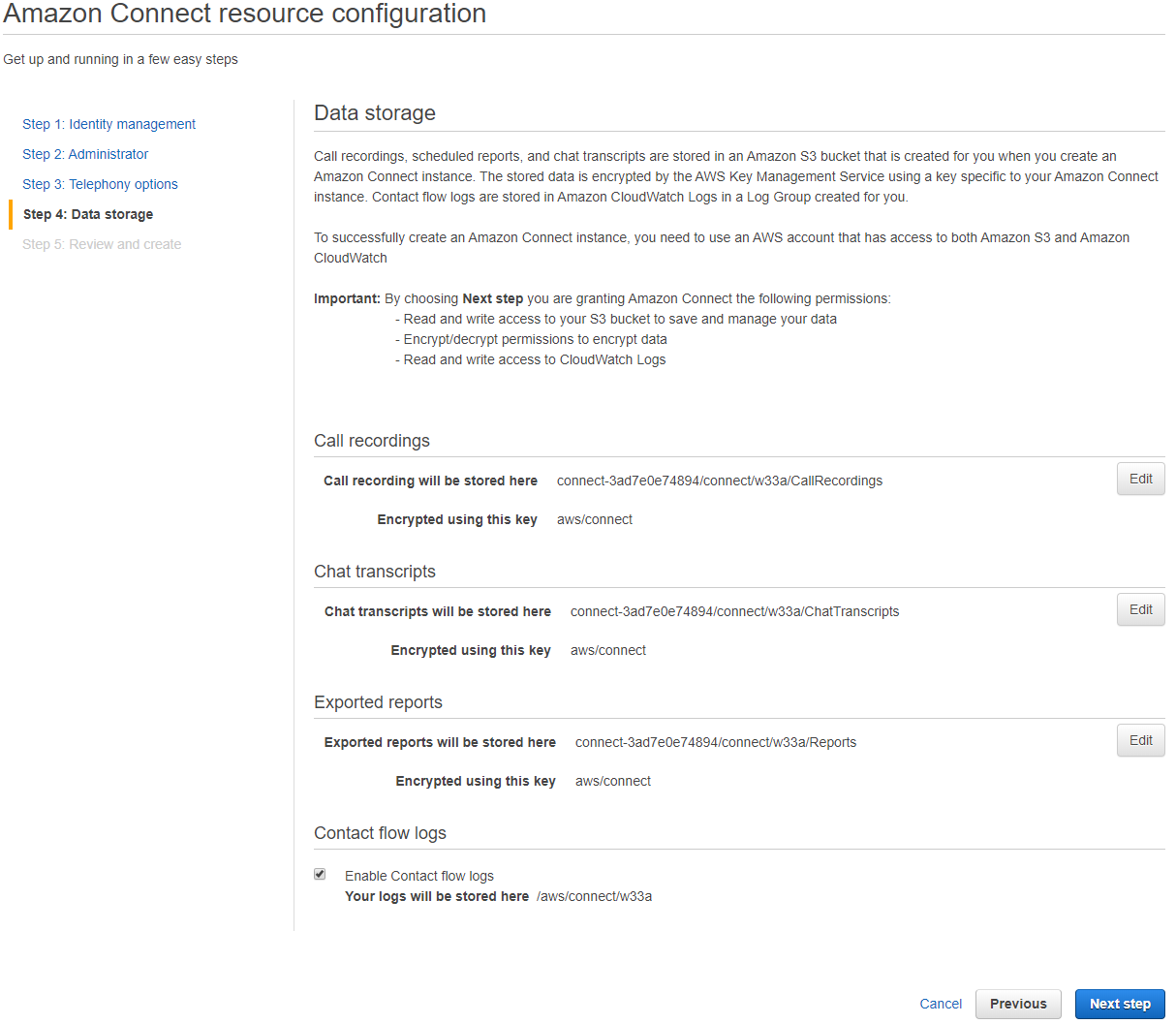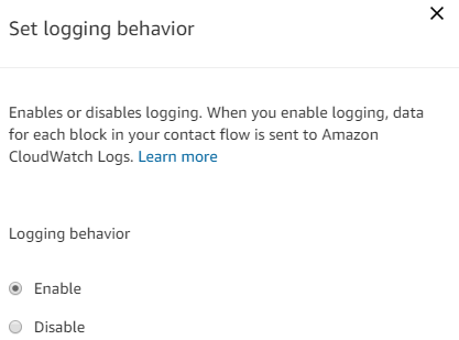 Next, we are going to enable logging, this enables logging for the flow to CloudWatch. This lets you see everything that happened to a stream (call or chat) going through the system.