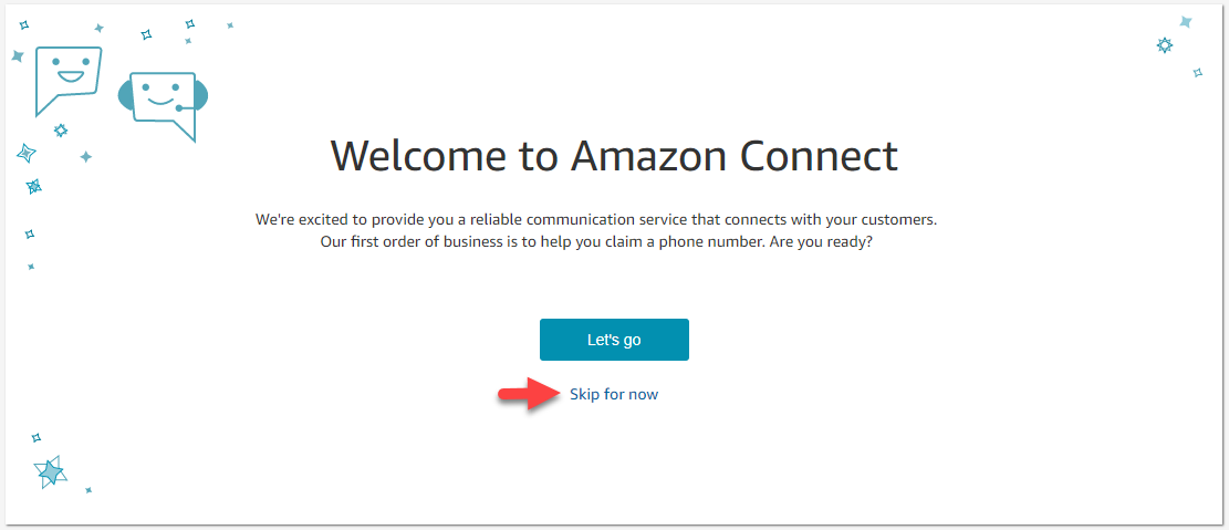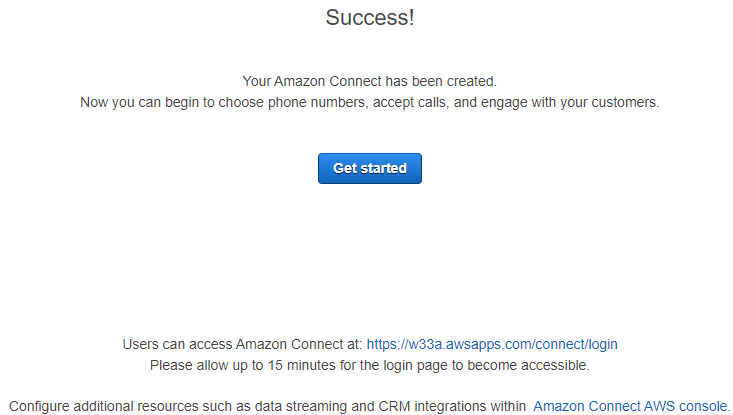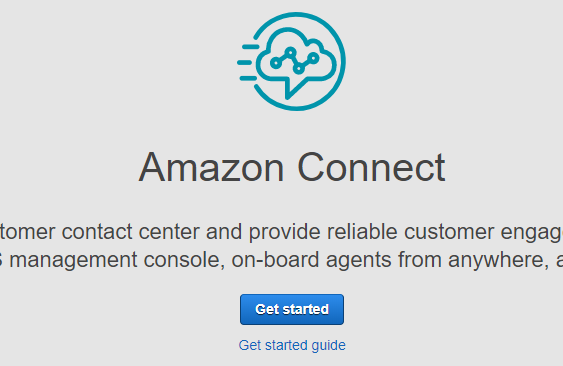 In the AWS Console, let’s go to Amazon Connect and click Get Started.