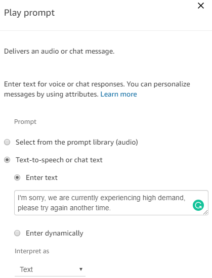 Now if we have an error along the way setting some settings, or we have no staff available, or our queue is at capacity, we are going to play a message saying sorry we are too busy and to please call back later.