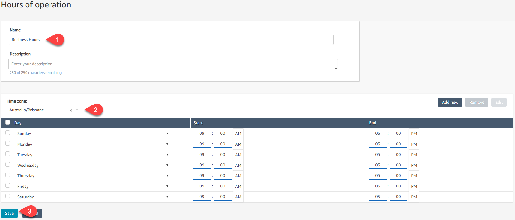 Next, we are going to configure the Hours of Operation, these are the hours that our support centre is open for.