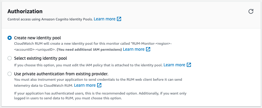 - Let RUM create a new Amazon Cognito identity pool (Easiest and the default)