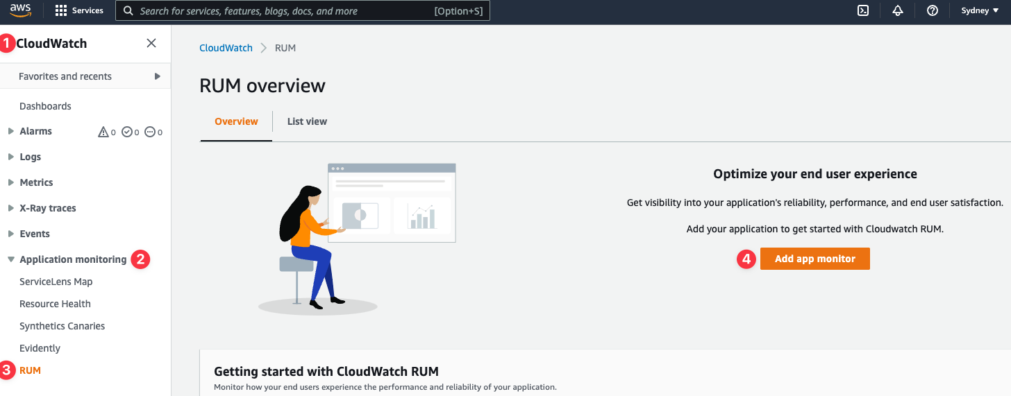 In the AWS Console, Go to CloudWatch, Open up Application monitoring and click RUM. Then click Add app monitor.